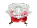 酷冷“黄金战士”的前身是Vortex TX,不过Vortex TX原先只供应国外市场,现在为了满足国内市场对LGA平台散热器需求的增长,酷冷对其做了一些改进,并且进行了重新包装。“黄金战士”采用了92mm 的大风扇,并且安装了透明风扇罩,视觉上给人一种赏心悦目的感觉。这款产品与Vortex TX最大的不同就是,风扇由含油来复轴承改进为合金轴承;作为酷冷的专利技术,合金轴承一般被使用在酷冷的高端散热器上,相比来复轴承,其使用寿命和稳定性得到很大的提高。通过附赠的扣具,可在LGA775和Socket 754/939/940平台上使用。